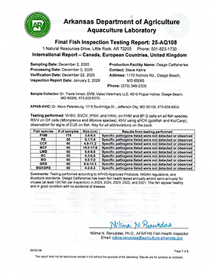 OCI is proud to offer the highest quality, disease-free fish to our customers. Our facilities are certified annually by health inspections from the University of Arkansas at Pine Bluff.
